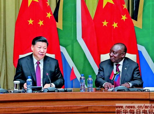 习近平指出,金砖国家领导人将在约翰内斯堡举行会晤。我期待同其他金砖国家、非洲国家以及其他新兴市场国家和发展中国家领导人一道,共商合作发展大计,将发展中国家团结合作提高到新水平,为促进世界和平与发展作出更大贡献。