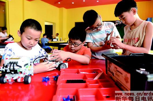 孩子们在进行机器人创意搭建。河北临城县青少年活动中心举办“乐享暑期嘉年华”系列公益活动,丰富孩子们暑期生活。