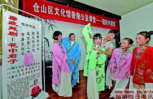 福州市利用暑期少儿公益课堂,推动“廉政文化进社区”。7月23日,在仓山区文化馆,小朋友在学习传统越剧《花中君子》。