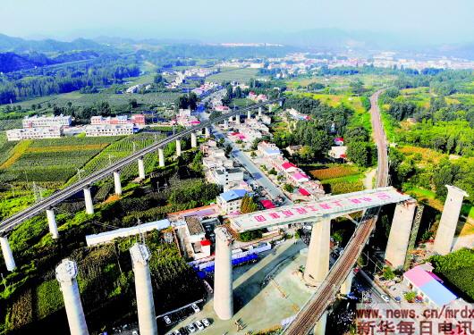 8月14日,我国在建最长的重载铁路——蒙华铁路峡河特大桥跨越宁西铁路曲线梁转体成功。蒙华铁路峡河特大桥位于河南省南阳市境内,全长879米。蒙华铁路北起内蒙古鄂尔多斯,终至江西吉安,是“北煤南运”的重要运输通道。