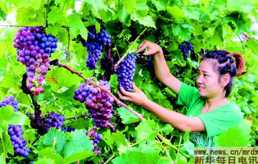 ▲8月14日,在河北永清县三圣口乡冰窖村,游客在采摘葡萄。河北省永清县三圣口乡冰窖村是该县有名的葡萄种植专业村。近年来,该村大力推广引进葡萄种植新技术、新品种,引导农民种植错季葡萄,实现了每年4月至9月都有不同品种的葡萄上市。目前全村种植葡萄5000余亩,年产值达3000余万元。