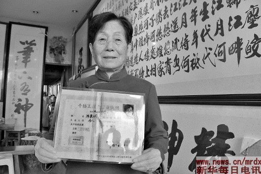 ▲冯爱倩拿着当年领到的个体工商业营业执照,执照由义乌县工商行政管理局于1984年颁发。(记者许舜达摄)