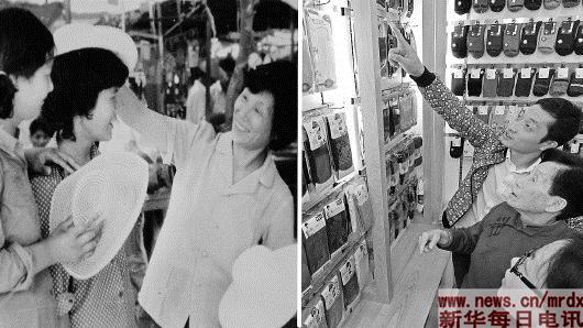 ▲这是一张拼版照片,左图为:义乌小商品市场第一代经营户冯爱倩(右一)在向顾客推销遮阳帽的资料照片(新华社发);右图为:2018年10月25日,78岁的冯爱倩(中)在倾听她的孙子、义乌国际商贸城经营户杨帆(上)介绍他自产自销的新款袜子(新华社记者谭进摄)。