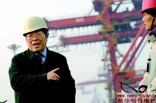 包起帆(左)来到上海港码头,向工人了解春节期间集装箱装运情况(2004年1月28日摄)。新华社记者张明摄