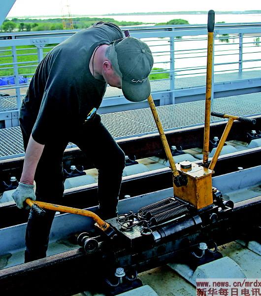 中铁大桥局中俄同江铁路大桥项目的建设者正在对钢轨精度进行微调(6月4日摄)。本报记者谢锐佳摄 |