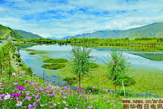 9月14日拍摄的金色池塘生态景区一景。初秋时节,西藏拉萨市达孜区塔杰乡巴嘎雪村金色池塘生态景区景色怡人。 新华社记者张汝锋摄