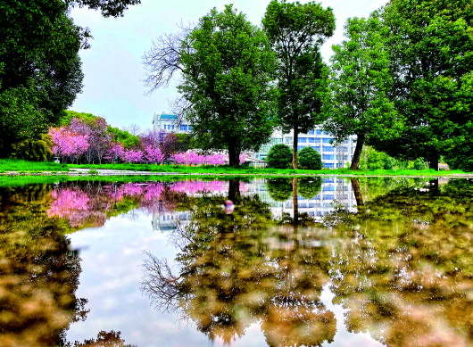 3月3日,樱花倒映在水中。近日,随着气温上升,武汉大学图书馆附近一片樱花开放。新华社记者费茂华摄