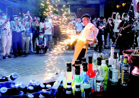 ▲5月24日,调酒师在上海思南公馆露天夜市表演花式调酒。